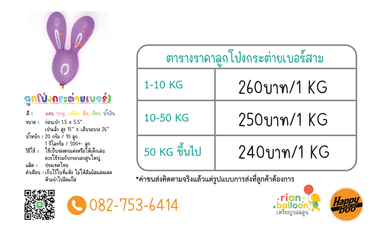 ชื่อสินค้า : ลูกโป่งกระต่ายเบอร์3 สี : เหลือง ส้ม แดง ชมพู เขียว น้ำเงิน ขนาด : ก่อนเป่ายาว 1.5 x 5.5” เป่าแล้ว 15 x C26” น้ำหนัก : 20 กรัม / 10 ลูก จำนวน : 500 ลูก / 1 กิโลกรัม วิธีใช้ : ใช้เป็นของตกแต่งหรือให้เด็กเล่น ผลิต : ประเทศไทย คำเตือน : เก็บไว้ในที่แห้ง ไม่ให้สัมผัสแสงแดด ไม่นำเข้าปาก