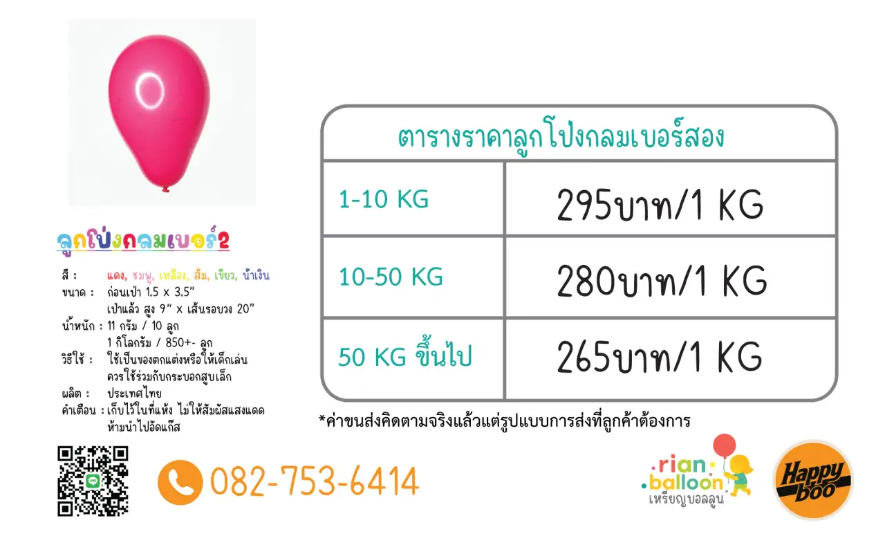 ชื่อสินค้า : ลูกโป่งกลมเบอร์2 สี : แดง ชมพู เหลือง ส้ม เขียว น้ำเงิน ขนาด : ก่อนเป่ายาว 1.5 x 3.5” เป่าแล้ว 9 x C20” น้ำหนัก : 11 กรัม / 10 ลูก จำนวน : 850 ลูก / 1 กิโลกรัม วิธีใช้ : ใช้เป็นของตกแต่งหรือให้เด็กเล่น ผลิต : ประเทศไทย คำเตือน : เก็บไว้ในที่แห้ง ไม่ให้สัมผัสแสงแดด ไม่นำเข้าปาก