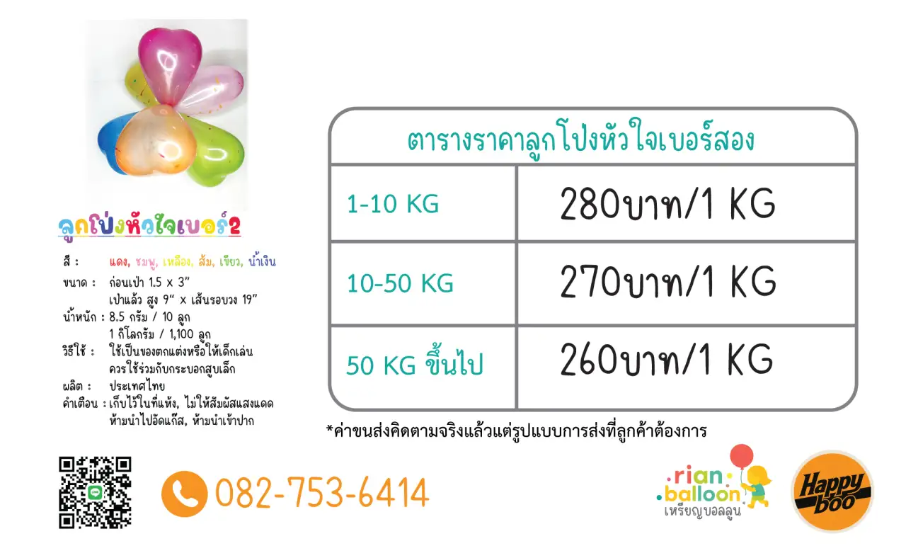 ชื่อสินค้า : ลูกโป่งหัวใจเบอร์2 (ใจจิ๋ว) สี : แดง ชมพู เหลือง ส้ม เขียว น้ำเงิน ขนาด : ก่อนเป่ายาว 4 x 7.5 cm หรือ 1.5 x 3” เป่าแล้ว 9 x C19” น้ำหนัก : 8.5 กรัม / 10 ลูก จำนวน : 1100 ลูก / 1 กิโลกรัม วิธีใช้ : ใช้เป็นของตกแต่งหรือให้เด็กเล่น ผลิต : ประเทศไทย คำเตือน : เก็บไว้ในที่แห้ง ไม่ให้สัมผัสแสงแดด ไม่นำเข้าปาก