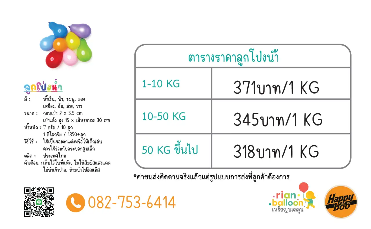 ชื่อสินค้า : ลูกโป่งน้ำ สี : น้ำเงิน ฟ้า ชมพู แดง เหลือง ส้ม ม่วง ขาว ขนาด : ก่อนเป่ายาว 2 x 5.5 cm เป่าแล้ว 15 x C30” น้ำหนัก : 7 กรัม / 10 ลูก จำนวน : 1300 ลูก / 1 กิโลกรัม วิธีใช้ : ใช้เป็นของตกแต่งหรือให้เด็กเล่น ผลิต : ประเทศไทย คำเตือน : เก็บไว้ในที่แห้ง ไม่ให้สัมผัสแสงแดด ไม่นำเข้าปาก