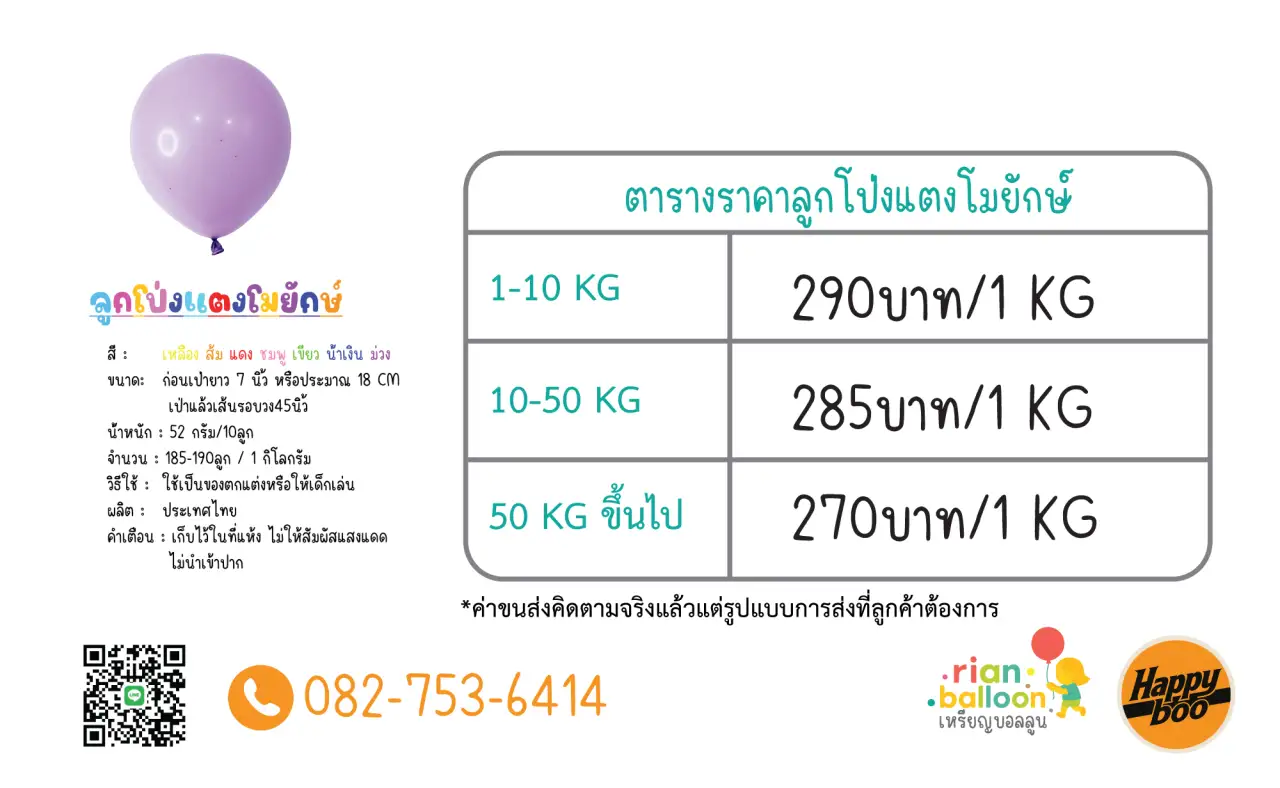 ชื่อสินค้า : ลูกโป่งแตงโม สี : เหลือง ส้ม แดง ชมพู เขียว น้ำเงิน ม่วง ขนาด: ก่อนเป่ายาว 7 นิ้ว หรือประมาณ 18 เซนติเมตร / เป่าแล้วเส้นรอบวง43นิ้ว น้ำหนัก : 52 กรัม/10ลูก จำนวน : 180-190 ลูก วิธีใช้ : ใช้เป็นของตกแต่งหรือให้เด็กเล่น ผลิต : ประเทศไทย คำเตือน : เก็บไว้ในที่แห้ง ไม่ให้สัมผัสแสงแดด ไม่นำเข้าปาก