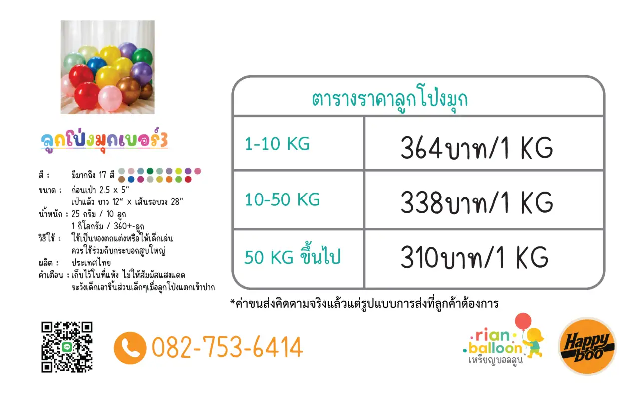ชื่อสินค้า : ลูกโป่งสีมุก เบอร์3 สี : 17 สี (ขายคละสี) ทางโรงงานจะไม่มีครบทุกสีนะคะ จะทำเวียนสีไป เพราะฉะนั้นเวลาส่งของ จะไม่ได้ครบทั้ง17สีนะคะ ขนาด : ก่อนเป่ายาว 2.5 x 5” / เป่าแล้ว 12 x C28” น้ำหนัก : 25 กรัม / 10 ลูก จำนวน : 360+ ลูก / 1 กิโลกรัม วิธีใช้ : ใช้เป็นของตกแต่งหรือให้เด็กเล่น ผลิต : ประเทศไทย คำเตือน : เก็บไว้ในที่แห้ง ไม่ให้สัมผัสแสงแดด ไม่นำเข้าปาก ห้ามนำไปอัดแก๊ส