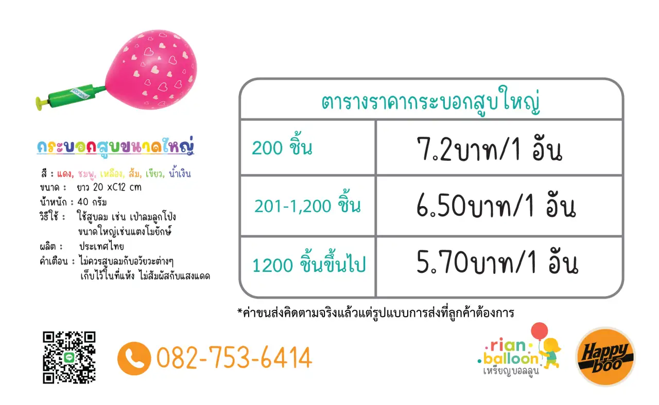 ชื่อสินค้า : กระบอกสูบใหญ่ ขนาด : ยาว 20 xC12 cm น้ำหนัก : 40 กรัม วิธีใช้ : ใช้สูบลม เช่น เป่าลมลูกโป่งขนาดใหญ่เช่นแตงโมยักษ์ ผลิต : ประเทศไทย คำเตือน : ไม่ควรสูบลมกับอวัยวะต่างๆ เก็บไว้ในที่แห้ง ไม่สัมผัสกับแสงแดด